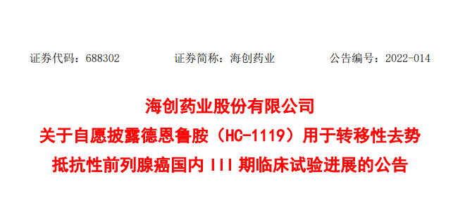 近日,海創(chuàng)藥業(yè)股份有限公司(以下簡稱“公司”)自主研發(fā)的德恩魯胺 (HC-1119)用于轉移性去勢抵抗性前列腺癌(mCRPC)的治療的多中心、隨機、 雙盲、安慰劑對照的 III 期臨床試驗(方案編號:...