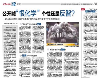 中央電視臺8套播某集團旗下“法×琳卡”15秒“我們恨化學”廣告,因代言明星連續(xù)重復喊叫了三次“我們恨化學”,引起北京大學84歲教授周公度在內的眾多化學界人士的不滿, 周在“狀告書”中稱“這是一則反科學...