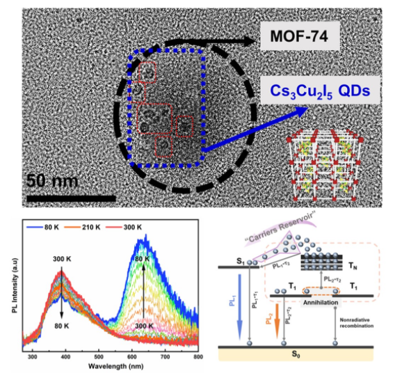 基于前期對無鉛鈣鈦礦量子點的研究基礎,北京大學物理學院現(xiàn)代光學研究所、人工微結構和介觀物理國家重點實驗室曲波課題組首次采用MOF限域法,在室溫條件下原位制備出高濕度穩(wěn)定性的無鉛類鈣鈦礦Cs3Cu2I5...