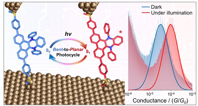 一般來說,共軛發(fā)光分子在短波長光的持續(xù)照射下,會連續(xù)不斷的發(fā)射出長波長光,這歸因于光照下的共軛分子在基態(tài)和激發(fā)態(tài)之間存在分子構型/電子云排布的互變循環(huán)過程。同時,共軛分子的電導性也與共軛路徑和電子云排...