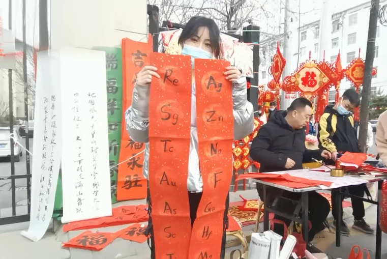 臨近過年,高一女生小羅在路邊寫春聯(lián)的攤位上,寫了一幅由化學(xué)元素符號組成的諧音春聯(lián),引路人駐足好奇圍觀。上聯(lián):Ag Zn Na F Ga Hf Mg;下聯(lián):Re Sg Tc Au As Sc Ti;橫批...