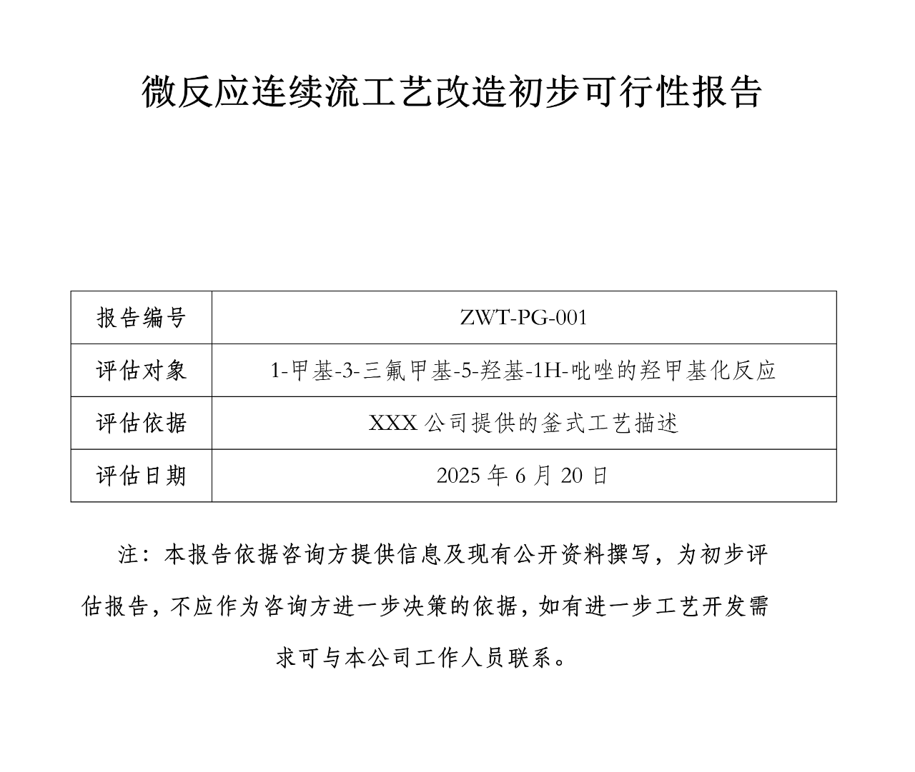 以“1-甲基-3-三氟甲基-5-羥基-1H-吡唑的羥甲基化反應(yīng)釜式工藝“為例,評(píng)估其向微反應(yīng)連續(xù)流工藝轉(zhuǎn)型的初步可行性評(píng)估報(bào)告示例: