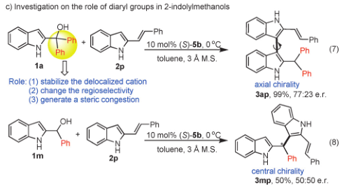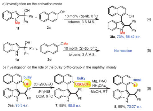 為了更好的研究反應機理,作者還設計對照實驗,如圖7a所示,當把2-萘酚中酚羥基保護時,反應不能發(fā)生,這說明酚羥基是通過氫鍵的方式參與并促進了反應。而圖7b表明,萘環(huán)的2-位取代基要具有一定的位阻來穩(wěn)定萘基吲哚骨架的構(gòu)型,否則連接兩個芳基的單鍵任意旋轉(zhuǎn)降低er選擇性。圖7c表明,2-吲哚甲醇中兩個芳基取代基的重要性,不僅能穩(wěn)定離域的碳正離子,還保證了反應的區(qū)域選擇性。作者還通過計算化學的方法,驗證了2-吲哚甲醇中兩個芳基取代基的重要性,大的取代基增加了單鍵旋轉(zhuǎn)的能壘從而保證了高的er選擇性。