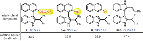 除了2-萘酚底物,作者還考察了苯酚類底物,也能在同樣條件下以良好的產(chǎn)率和er選擇性得到軸手性的苯基吲哚骨架,這也為軸手性的苯基吲哚骨架合成提供了一種全新的方法。
