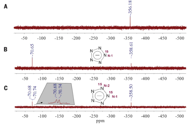 胡炳成、陸明團隊報道了一種從芳基五唑制備含全氮陰離子(N5ˉ)化合物的方法,首次制得了室溫下穩(wěn)定、含有N5ˉ離子的鹽(N5)6(H3O)3(NH4)4Cl并對其進行了表征。熱分析結果顯示其分解溫度高達116.8 ℃,具有非常好的熱穩(wěn)定性。該物質的成功合成是N5ˉ離子高能化合物合成里程碑性的一步,對全氮化合物合成具有重要的科學意義。