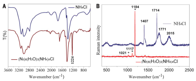 如圖2所示,作者還通過核磁共振氮譜對五氮負離子及15N標記的五氮負離子進行了表征,圖3則是(N5)6(H3O)3(NH4)4Cl的紅外和拉曼光譜,這些信息進一步確定了其結構。