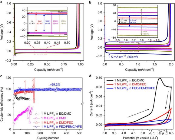 圖1. 不同電解液的電化學(xué)性能對比。(a)Li金屬在1M LiPF6FEC/FEMC/HFE氟化電解液中的沉積-溶解曲線;(b)不同沉積-溶解電流下的曲線;(c)不同電解液的Li金屬的沉積-溶解庫倫效率對比,電流密度0.2 mA/cm2;(d)不同電解液的氧化CV曲線。掃描速度:5 mV/s.