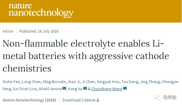 Xiulin Fan, Long Chen, Oleg Borodin, Xiao Ji, Ji Chen, Singyuk Hou, Tao Deng, Jing Zheng, Chongyin Yang, Sz-Chian Liou, Khalil Amine, Kang Xu & Chunsheng Wang . Non-flammable electrolyte enables Li-metal batteries with aggressive cathode chemistries.