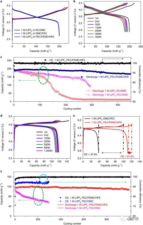 以NMC811(4.4 V)和LCP(5 V)為正極,我們配成了相應(yīng)的鋰金屬電池, 1 M LiPF6in FEC/FEMC/HFE電解液大幅提高了其循環(huán)穩(wěn)定性和庫倫效率。對于NMC811,循環(huán)450周期后,容量保持率為90%左右。而對于LiCoPO4,循環(huán)1000周期后,其容量保持率高達(dá)93%左右,并且與1 M LiPF6in FEC/DMC相比,其庫倫效率有了大幅提高,從95%提升到99.8%以上。并且充電到5V后,靜置48小時后,LiCoPO4依然可以放出91.6%的容量,而對于1 M LiPF6in FEC/DMC,僅能放出37.9%的容量。
