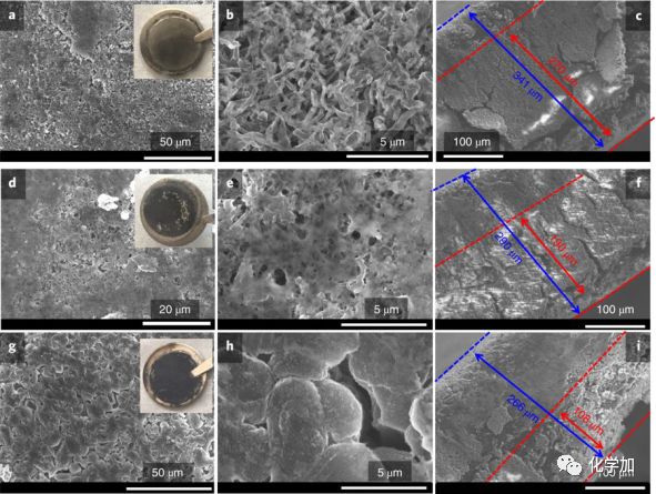 圖2.不同電解液中鋰金屬循環(huán)后的SEM形貌。(a-c)1M LiPF6in EC/DMC; (d-f): 1M LiPF6 in FEC/DMC; (g-i) 1 M LiPF6in FEC/FEMC/HFE.