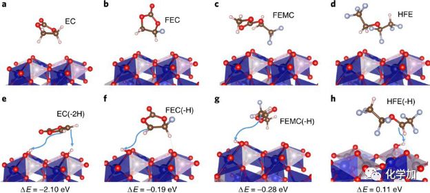 圖5. 幾種不同溶劑在充電狀態(tài)的CoPO4正極表面的理論計(jì)算 (PBE+UDFT)的可能反應(yīng)。(a-d)初始狀態(tài);(e-h)反應(yīng)狀態(tài)及其相應(yīng)的反應(yīng)能量。