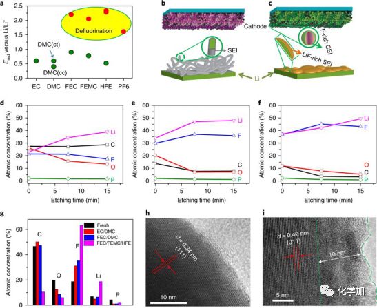 圖4. 電解液不同溶劑的分解過程理論計(jì)算及其在正負(fù)極材料上的界面分析。(a)電解液中溶劑化的溶劑及PF6陰離子分解電位計(jì)算(G4MP2 calculations with the SMD implicit solvent model; (b、c) 不同電解液中形成的鋰金屬負(fù)極SEI和正極CEI對比示意圖,b普通電解液,c 1M LiPF6FEC/FEMC/HFE電解液。(d-f)不同電解液中Li金屬表面的SEI成分隨Ar+刻蝕時間變化,d 1 M LiPF6EC/DMC, e LiPF6 FEC/DMC, f 1 M LiPF6FEC/FEMC/HFE. (g)LiCoPO4正極材料在不同電解液中循環(huán)后的CEI成分對比。(h)原始的LiCoPO4正極材料的高分辨透射照片;(i)在1 M LiPF6 FEC/FEMC/HFE電解液中循環(huán)后的LiCoPO4正極材料的高分辨透射照片。