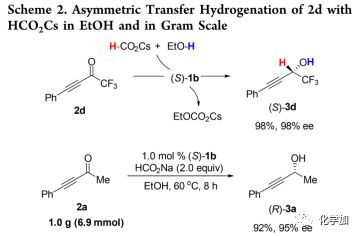 通過原位紅外光譜追蹤炔基酮2d與HCOOCs的不對稱轉(zhuǎn)移氫化(Figure 1)。實(shí)驗(yàn)發(fā)現(xiàn),HCOOCs提供氫后轉(zhuǎn)化為碳酸乙基銫(EtOCO2Cs)。當(dāng)2d(1704cm-1)與1.2 eq HCOOCs(1602cm-1)在(S)-1b (2 mol %)催化下于60 ℃反應(yīng)時(shí),1704和1602cm-1處的峰迅速降低,而新峰1640cm-1(屬于EtOCO2Cs)增加。反應(yīng)3 h后,1704和1602cm-1處的峰消失,1640cm-1處的峰成為單個(gè)主峰。此外,在1743cm-1(屬于乙酸乙酯)處沒有明顯的峰。這些結(jié)果表明甲酸鹽和EtOH在反應(yīng)中分別用作氫化物和質(zhì)子源(Scheme 2)。