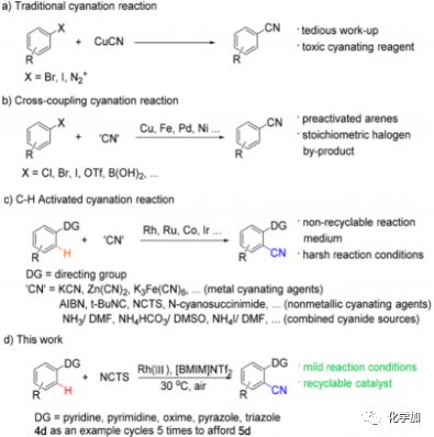 總結(jié):吳勇教授課題組實現(xiàn)了利用離子液體[BMIM]NTf2作為可回收介質(zhì)的首例C-H鍵氰化策略。該方法擴展了Rh催化C-H官能化反應(yīng)的應(yīng)用范圍,即首次在室溫下以可回收的方式實現(xiàn)了氰化反應(yīng)。此外,在該方法中可以使用多種不同的導(dǎo)向基團,并成功合成了許多芳族和雜芳腈。