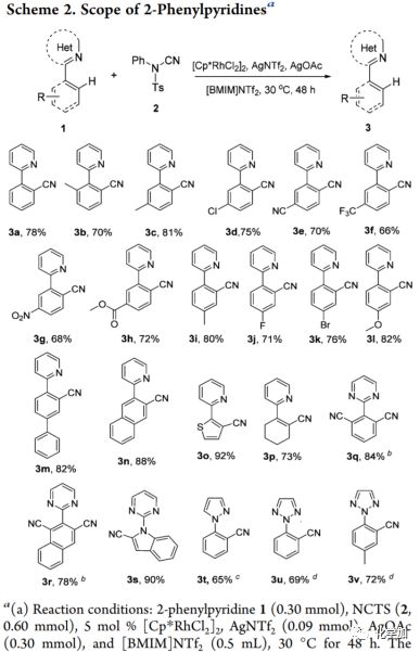 在最優(yōu)反應(yīng)條件下,作者首先考察了2-苯基吡啶的C-H鍵氰化。連有給電子基或吸電子基的底物都能與反應(yīng)體系兼容,并以良好的收率得到相應(yīng)的氰化產(chǎn)物3a-3l。當(dāng)2-苯基部分被2-聯(lián)苯基,2-萘基和2-噻吩基取代時,與3a相比,3m-3o的收率明顯提升。有趣的是,當(dāng)2-芳香環(huán)被2-脂肪族環(huán)取代時(如2-環(huán)己烯),氰化反應(yīng)仍能繼續(xù)進行形成產(chǎn)物3p,收率為73%。該結(jié)果表明氰化反應(yīng)不僅能直接芳族官能化,也可以應(yīng)用于脂族烯烴。值得注意的是,將導(dǎo)向基團(DG)變?yōu)槠渌鸑-雜環(huán)如嘧啶,吡唑和三唑也能順利得到氰化產(chǎn)物3q3v。