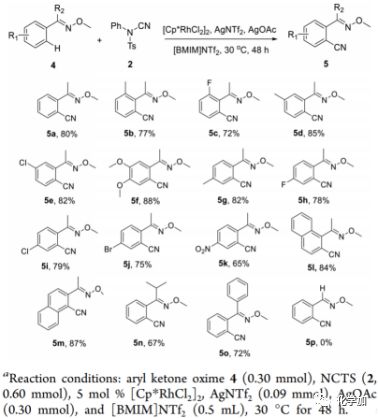 在上述成果的鼓舞下,作者繼續(xù)考察在氰化反應(yīng)中利用肟作導(dǎo)向基的可行性。幸運的是,1-苯基-O-甲基肟可以80%的分離產(chǎn)率得到5a。各種常見的官能團(如甲基,甲氧基,鹵素,甚至硝基)都具有良好的耐受性,并以良好至優(yōu)異的收率得到相應(yīng)的產(chǎn)物5b5k。肟醚的空間位阻使得5n和5o的收率有所降低,并且未觀察到產(chǎn)物5p。