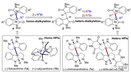 如圖1所示,許多天然二聚和低聚的六氫吡咯吲哚(HPI)生物堿(包括同型和異型)都具有重要的生物活性,如抗真菌和抑制細(xì)胞生長作用等。從結(jié)構(gòu)上講,這些分子通常在C3a和C3a’處包含一對具有空間位阻的季碳中心,從有機(jī)合成的角度來看,這是一個“艱巨的挑戰(zhàn)”。事實上,對于這種結(jié)構(gòu)基元的催化不對稱合成非常困難,到目前為止僅有雙Michael加成和雙脫羧烯丙基化等方法,而且,這些報道的方法在收率和選擇性方面并不高,它們只適用于同型生物堿的合成。因此,非常有必要開發(fā)一種更高效和通用的催化不對稱二烷基化方法來合成這類結(jié)構(gòu)基元。
