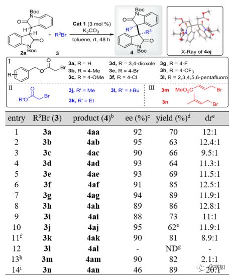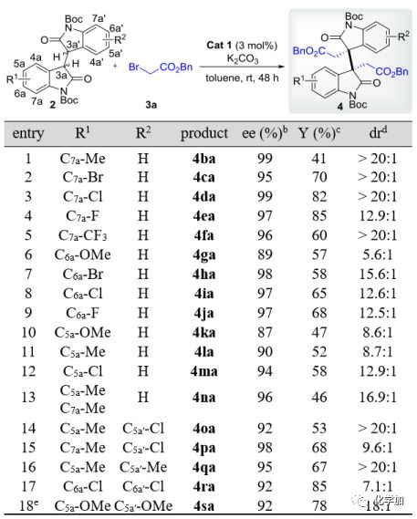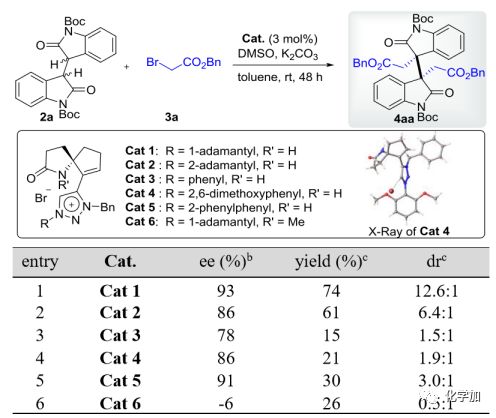 作者首先設(shè)計和制備了幾種新型的SPA-三唑溴化銨催化劑(Cat 1-6,圖2),并通過Cat 4的單晶證實了它們的絕對構(gòu)象。以二聚氧化吲哚2a和4當(dāng)量商業(yè)可得的溴乙酸芐酯3a為模型底物,研究了有機(jī)催化的不對稱二烷基化反應(yīng)。通過對各種溶劑、堿和添加劑的篩選,最終發(fā)現(xiàn)在3 mol% Cat 1(entry 1,74%收率,93% ee,12.6:1 dr)的條件下,甲苯中室溫反應(yīng),就能較好地得到預(yù)期的同種二烷基化產(chǎn)物4aa。雖然其它催化劑(Cat 2-6)也能催化這一反應(yīng)(entry 2-6),但結(jié)果較差。值得注意的是,N-甲基取代的Cat 6對映選擇性最差(-6% ee,entry 6),表明在該不對稱反應(yīng)中,SPA型催化劑中N-質(zhì)子的存在是立體選擇性的必要條件。