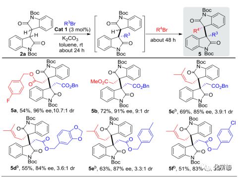 完成了二聚氧化吲哚的同種二烷基化反應(yīng),接著作者用兩種不同的親電試劑R3Br和R4Br,研究了更具挑戰(zhàn)性的一鍋法不同種的二烷基化。最初作者發(fā)現(xiàn)在Cat 1(3 mol%)催化下, 1當(dāng)量的3a和2a反應(yīng)能得到單烷基化產(chǎn)物,化學(xué)選擇性良好,產(chǎn)率約85%,沒有檢測到二烷基化產(chǎn)物。根據(jù)這一觀察結(jié)果,在2a消失后,向反應(yīng)體系中加入3當(dāng)量的3g,就得到了所需的不同種二烷基化產(chǎn)物5a,產(chǎn)率54%,ee值96%。受此鼓舞,使用不同的親電試劑R3Br, 作者又嘗試了更多的不同種二烷基化反應(yīng),均能得到預(yù)期的產(chǎn)物5b-f。特別地,5c-f可作為關(guān)鍵中間體,用于合成復(fù)雜的HPI生物堿。