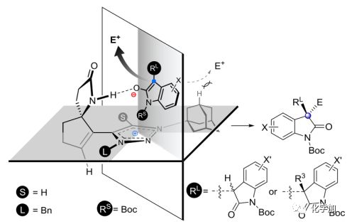 接著,作者對三唑催化的烷基化反應(yīng)過程中的立體化學(xué)控制進(jìn)行了探究,根據(jù)觀察到的結(jié)果,作者提出了單烷基化和二烷基化反應(yīng)的親核進(jìn)攻模型(圖 6)。由于Cat 6沒有酰胺N-H部分,僅給出了較差的立體選擇性。而在Cat 1和烯醇式反應(yīng)時,每一步烷基化過程中都可能存在氫鍵和離子對相互作用,由于金剛烷基大的位阻作用,中間體從背面向親電試劑的親核進(jìn)攻是不利的,從而導(dǎo)致主要形成(S,S)-二烷基化產(chǎn)物。