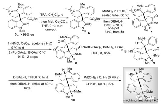 為了驗證該催化不對稱二烷基化反應(yīng)的有效性,作者還將其用于了天然產(chǎn)物的全合成中,實現(xiàn)了(–)-folicanthine (1a)的形式全合成和(–)-chimonanthidine (1c)的首次不對稱全合成。在(1c)的合成中,主要挑戰(zhàn)在于在兩個吡咯烷環(huán)存在下,如何選擇性地用甲基僅保護(hù)一個N-H。而用不同種二烷基化產(chǎn)物5c(可以克級規(guī)模制備,重結(jié)晶后ee大于99%)作為關(guān)鍵中間體,只需要一次柱層析純化,經(jīng)脫Boc、甲基保護(hù)、胺解及還原胺化就可以有效地得到關(guān)鍵的合成子7,具有81%的總收率,區(qū)域選擇性還原實現(xiàn)了吲哚部分的胺化/環(huán)化反應(yīng),隨后化合物7的C=C鍵氧化裂解,得到醛化合物8,通過還原胺化反應(yīng)得到產(chǎn)物9,再一次還原胺化/環(huán)化反應(yīng)生成第二個吡咯烷環(huán),最后在Pd(OH)2/C催化條件下脫去芐基保護(hù)基,就實現(xiàn)了(–)-chimonanthidine (1c)的首次不對稱全合成。