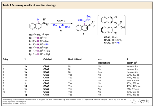 手性磷酸可同時活化含弱酸性氫原子的2-萘胺和偶氮二羧酸酯生成雙重氫鍵中間體A,從而構(gòu)建手性N-C軸(Fig. 2a)。因此,作者使用N-取代2-萘胺1和偶氮二甲酸二叔丁酯(DBAD)2a作為模板底物,并對反應進行了篩選(Table 1)。作者發(fā)現(xiàn)N-Me,Ph二取代的2-萘胺1a不能得到相應產(chǎn)物,而具有N-H鍵的偶氮二羧酸酯1b和1c則能順利得到相應的胺化產(chǎn)物。這些結(jié)果表明N-H鍵對該反應起著至關(guān)重要的作用。但即使使用位阻較大的Ph-或Ph3Si-取代的手性磷酸,該反應的對映選擇性均較低。理論上,通過增大2-萘胺C8位取代基的空間位阻是可以提高產(chǎn)物的對映選擇性得,但這會極大地限制該反應的底物范圍。