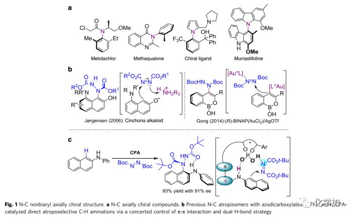 軸手性化合物廣泛存在于手性催化劑及配體中,其化學合成備受關(guān)注。BINAP和BINOL等二芳基軸手性化合物的合成已經(jīng)取得了不錯的進展,但關(guān)于合成同樣重要的非二芳基N-C軸手性化合物(Fig. 1a)的報道卻很少。到目前為止,合成非二芳基N-C軸手性化合物的方法主要包括手性拆分和對非手性N-C鍵化合物進行不對稱環(huán)化反應、N-官能團化反應和去對稱化反應等,而通過構(gòu)建新的N-C鍵合成手性非二芳基N-C軸手性化合物仍然面臨巨大的挑戰(zhàn)。