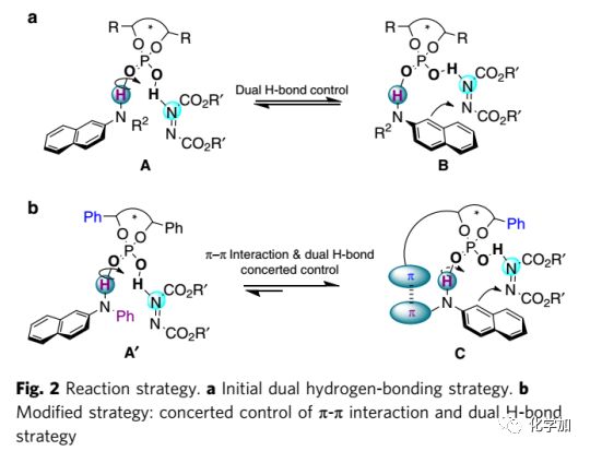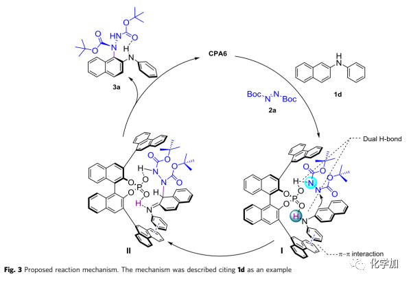 根據(jù)實驗結(jié)果以及前人的報道,作者推測可能的機理(Fig. 3):首先,CPA通過雙重氫鍵活化模式同時活化N-苯基-2-萘胺和偶氮二羧酸酯生成中間體I。然后,在π-π相互作用下,N-苯基-2-萘胺與偶氮二羧酸酯發(fā)生親核加成反應生成中間體II。II重新芳構(gòu)化生成胺化產(chǎn)物3a。