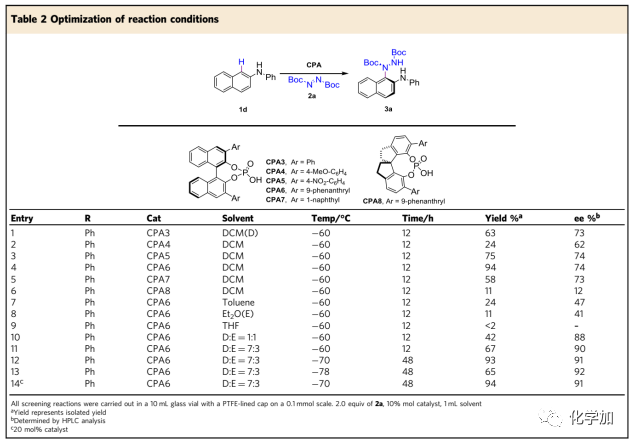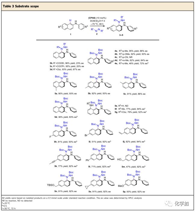 確定N-苯基-2-萘胺1d和DBAD 2a為模板底物后,作者通過對催化劑、溶劑、溫度等反應條件進行篩選,確定最優(yōu)的反應條件(Table 2):10 mol% CPA6為催化劑,DCM:Et2O = 7:3為溶劑,在-70 ℃條件下反應48 h,能以93%的收率和91%的對映選擇性得到相應產(chǎn)物。