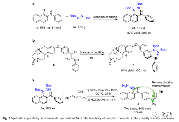 為了證明該反應的應用潛力,作者進行了克級規(guī)模反應(Fig. 5),也能以87%的收率和90%的對映選擇性得到相應產(chǎn)物。緊接著,作者證明了該策略在復雜分子的后期修飾中的可行性。標準條件下,雌酮衍生物6具有良好的耐受性,能以優(yōu)秀的收率、對映選擇性以及非對映選擇性得到產(chǎn)物7。此外,磷酸二苯酯可催化N-C軸手性胺化產(chǎn)物3a與(E)-1,3-二苯基丙-2-烯-1-醇在-30 ℃條件下的DCE溶劑中反應24 h,能以72%的收率得到相應產(chǎn)物。該產(chǎn)物在HCl/MeOH中脫掉Boc基團后可實現(xiàn)C1-到C8位遠程手性轉(zhuǎn)換。