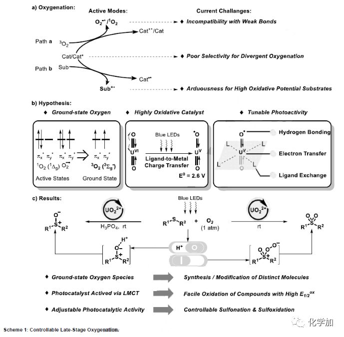 選擇性氧氣氧化的內(nèi)在挑戰(zhàn)可以通過兩個基本的活化模式來說明(Scheme 1a)。路徑a,激活氧分子從三線態(tài)(3O2)到單線態(tài)氧(1O2)或氧自由基陰離子(O2-?)等,但是這些活性氧物種與低鍵離解能的化學(xué)鍵兼容性差。路徑b,通過底物(Sub)和催化劑(Cat)之間的單電子轉(zhuǎn)移過程活化底物,然而高氧化電勢底物的活化往往受限于催化劑的氧化能力。此外,催化劑的活性一般不能被有效地調(diào)控,從而導(dǎo)致氧化過程的可控性較難實現(xiàn),想要解決如上困難還需開發(fā)一個有效的催化體系。