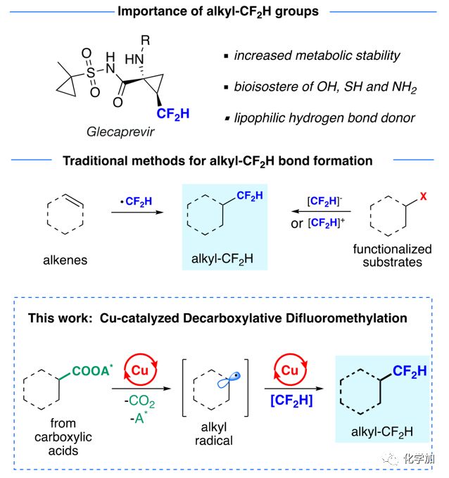 美國邁阿密大學(xué)Wei Liu課題組在前期開發(fā)銅介導(dǎo)烷基化合物氟官能團(tuán)化反應(yīng)(Chem. Eur. J.2018, 11559-11563.J. Am. Chem. Soc.2019, 141, 3153-3159.)基礎(chǔ)上,考慮以烷基自由基為合成二氟甲基化合物的活性中間體,其可由自然界中廣泛存在的羧酸通過氧化或還原手段引發(fā)自由基脫羧生成;如果能以羧酸為起點(diǎn),實(shí)現(xiàn)活性分子的二氟甲基化,將極大豐富二氟甲基化合物合成的手段。目前,活化羧酸的主流方法包括可見光催化引發(fā)或過渡金屬催化的脫羧等。銅元素作為一種常見金屬,廉價(jià)易得;但其穩(wěn)定性和催化性質(zhì)受環(huán)境影響大,作為催化劑的潛力尚待發(fā)掘。由于目前仍未有烷基自由基作為中間體的二氟甲基化反應(yīng)的報(bào)道,作者猜想,能否將銅作為二氟甲基向烷基自由基轉(zhuǎn)移的媒介,結(jié)合羧酸易生成烷基自由基的特點(diǎn),實(shí)現(xiàn)脂肪酸的脫羧二氟甲基化反應(yīng)。最近,他們與中科院山西煤炭所的曹直研究員團(tuán)隊(duì)合作,成功實(shí)現(xiàn)了該轉(zhuǎn)化。