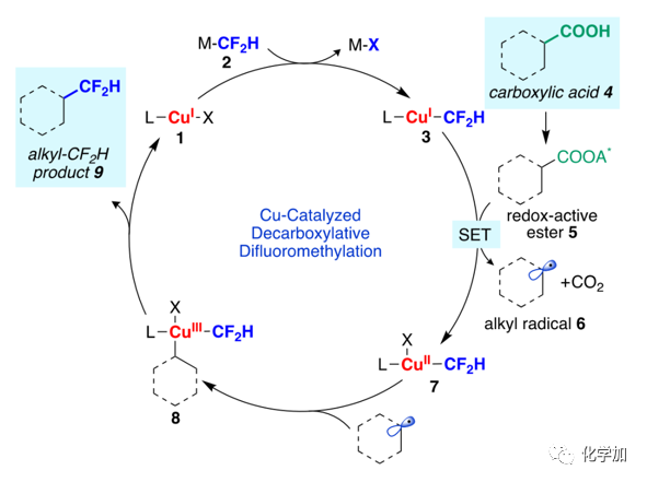 作者設(shè)計(jì)了如下催化循環(huán),CuI1與二氟甲基試劑2首先發(fā)生轉(zhuǎn)金屬化得到二氟甲基銅物種[CuI-CF2H]3,經(jīng)計(jì)算,以AgCl為參比電極時(shí),其標(biāo)準(zhǔn)電極電勢為-1.2 V(E0= –1.2 V vsAg/AgCl),其可能與活化酯5(RAE, E = –1.2 V vs Ag/AgCl)發(fā)生電子轉(zhuǎn)移被氧化為CuII7;5同時(shí)被還原,發(fā)生自由基脫羧得到烷基自由基6;6,7迅速重組得到CuIII8,隨后還原消除得到二氟甲基化產(chǎn)物9并再生催化劑1進(jìn)入新的催化循環(huán)。