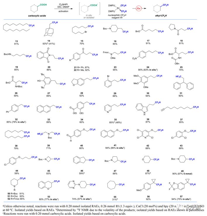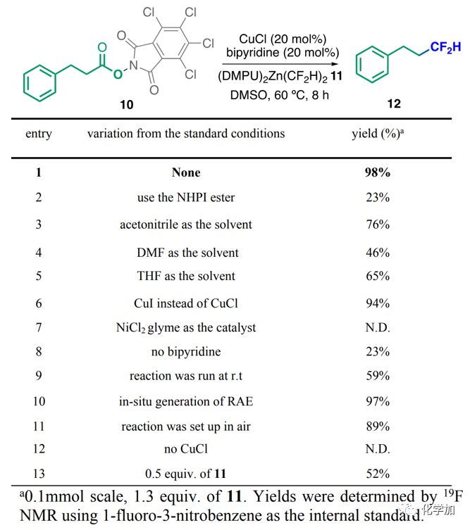 作者隨后以RAE 10的脫羧二氟甲基化反應(yīng)為模型反應(yīng)對反應(yīng)條件進(jìn)行探究。其最優(yōu)條件為:以20 mol% CuCl為催化劑,20 mol% bpy為配體,1.3當(dāng)量 (DMPU)2Zn(CF2H)2為二氟甲基化試劑,60 oC下于DMSO中反應(yīng)8小時(shí),能以98%收率得到二氟甲基化產(chǎn)物12(entry 1);經(jīng)驗(yàn)證,不同的NHPI酯(entry 2),溶劑的改變(entry 3-5),催化劑、配體的有無(entry 8, 12)及反應(yīng)溫度的改變(entry 9)均會(huì)對反應(yīng)效率產(chǎn)生影響;在其他文獻(xiàn)中能夠用于催化RAE自由基脫羧的NiCl2·DME無法催化該反應(yīng)(entry 7);反應(yīng)對銅鹽(entry 6)、空氣(entry 11)及現(xiàn)場生成10時(shí)引進(jìn)的雜質(zhì)(entry 10)不敏感;將二氟甲基試劑降至當(dāng)量,收率有所降低(entry 13);加入過量二氟甲基試劑時(shí),反應(yīng)中檢測到1,1,2,2-四氟乙烷(HCF2CF2H)及二氟甲烷(CF2H2)的生成。