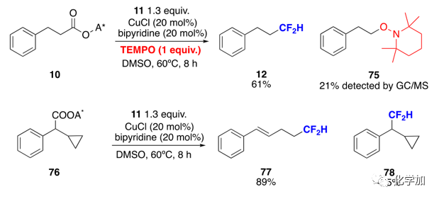 為驗(yàn)證反應(yīng)機(jī)理,作者向底物10的脫羧二氟甲基化反應(yīng)體系中加入1.0當(dāng)量的自由基捕獲劑TEMPO,此時(shí)12的收率降低并檢測到TEMPO捕獲產(chǎn)物75。通過76的自由基鐘實(shí)驗(yàn),作者以77%收率得到開環(huán)產(chǎn)物。這兩項(xiàng)實(shí)驗(yàn)證明反應(yīng)經(jīng)歷了烷基自由基歷程。