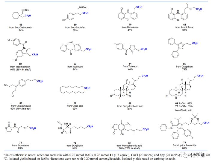 作者隨后對復(fù)雜活性分子進(jìn)行了二氟甲基化修飾。含二氟甲基的加巴噴丁58,巴氯芬59,雙氯酚酸60,醋氯酚酸61能以中等至優(yōu)秀的收率得到。雜環(huán)藥物,包括吲哚美辛62,伊索克酸63,托美汀64和奧沙普秦65也可以順利反應(yīng)。甾體羧酸(68-70),厄多司坦(71)和生物素(72)中的羧基也以中等以上收率被轉(zhuǎn)化為二氟甲基。結(jié)構(gòu)復(fù)雜的霉酚酸(73)和立普妥(74)的脫羧二氟甲基化反應(yīng)結(jié)果也令人滿意。其中,化合物62,66和73可通過一鍋法得到,證明該方法在藥物改造中同樣奏效,進(jìn)一步降低了復(fù)雜分子二氟甲基化修飾的難度。