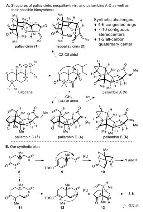 自1994年以來,化學(xué)家們從苔類植物中分離和表征了一組具有并環(huán)呋喃酮的非常復(fù)雜的二萜化合物,如pallavicinin (1)、pallavicinin (2)和pallambins A-D(3-6)(圖1A),它們含有4-6個(gè)擁擠環(huán)和7-10個(gè)連續(xù)手性中心,包括1-2個(gè)全碳季碳中心,其全合成極具挑戰(zhàn)。然而,這類天然物并沒有顯示出顯著的生物活性,可能是因?yàn)樗鼈冏匀粊碓礃O少,從而限制了其生物評(píng)價(jià)。因此,對(duì)這些二萜類化合物進(jìn)行簡明的化學(xué)合成可以提高這些分子的可用性,以便進(jìn)行全面的生物評(píng)估。