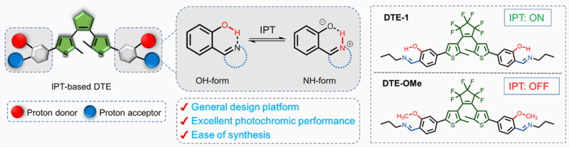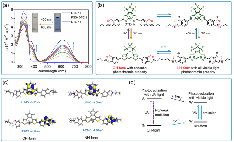 分子內(nèi)質(zhì)子轉(zhuǎn)移(Intramolecular Proton Transfer, IPT)是一個普遍存在于氫鍵體系中的現(xiàn)象,如在水楊基亞胺類化合物中,活潑氫在質(zhì)子給體酚羥基與質(zhì)子受體亞胺鍵之間存在動態(tài)轉(zhuǎn)移平衡過程,當活潑氫從氧原子轉(zhuǎn)移到氮原子上,即從OH-構(gòu)型轉(zhuǎn)移到NH-構(gòu)型,與OH-構(gòu)型相比,該課題組創(chuàng)新利用IPT產(chǎn)生的NH-構(gòu)型吸收紅移,從而率先實現(xiàn)全可見光驅(qū)動的光致變色現(xiàn)象(all-visible-light triggered photochromism),同時也兼顧了其優(yōu)異的光調(diào)控效率和良好的熱穩(wěn)定性、優(yōu)異的抗疲勞度等性能。作為一種通用的設(shè)計策略,該分子內(nèi)質(zhì)子轉(zhuǎn)移單元IPT的引入,首次發(fā)展成可靠的模塊設(shè)計全可見光驅(qū)動的二噻吩乙烯染料體系,可有效避免短波長的紫外光,最終以更溫和的可見光替代紫外光激發(fā)其光異構(gòu)化過程,成功拓寬其應(yīng)用領(lǐng)域,為全可見光調(diào)控二噻吩乙烯光致變色染料及光開關(guān)的設(shè)計提供了簡單有效、直接明確的新思路。