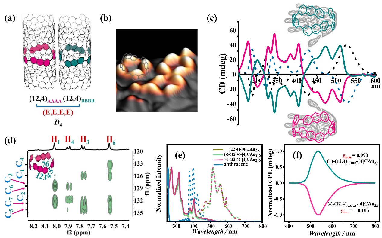 圖1. [4]CAn2,6手性碳納米大環(huán)的表征及其性質(zhì)研究。(a)嵌入在相應(yīng)碳納米管中的[4]CAn2,6大環(huán)及其手性指數(shù)、單體連接單鍵處的立體構(gòu)型、所屬分子點(diǎn)群; (b) 3D高分辨STM圖像;(c) CD光譜;(d) 2D (H, C)-HMBC NMR譜;(e) 紫外及熒光光譜;(f) CPL光譜。