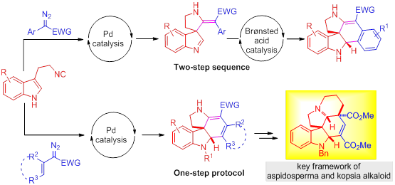 廣州大學(xué)化學(xué)化工學(xué)院劉運林副教授課題組一直致力于吲哚啉及含氟化合物的合成研究。最近,他們在前期工作基礎(chǔ)上進一步設(shè)計并實現(xiàn)了3-(2-異氰乙基)吲哚可以與重氮化合物通過交叉偶聯(lián)/螺環(huán)化/Mannich-type串聯(lián)反應(yīng),合成了一系列具有兩個連續(xù)手性中心的多環(huán)螺吲哚啉骨架。該策略對于α-芳基取代的重氮底物,由于芳基的親核性較弱,反應(yīng)選擇性生成三環(huán)螺吲哚啉化合物。在手性磷酸的催化下,這些三環(huán)螺吲哚啉化合物可以進行后續(xù)的分子內(nèi)Mannich-type環(huán)化反應(yīng),進而成功實現(xiàn)了多環(huán)螺吲哚啉的不對稱合成。該方法反應(yīng)條件溫和,操作簡單,底物普適性廣,產(chǎn)率較高、官能團兼容性良好。利用此方法,他們通過幾步簡單的化學(xué)轉(zhuǎn)化簡潔高效地完成了aspidosperma和 kopsia生物堿五環(huán)核心骨架的構(gòu)建,為日后這兩類天然產(chǎn)物的全合成提供了新的研究思路與方法。此外,該研究工作進一步豐富了3-(2-異氰乙基)吲哚的反應(yīng)模式,為多環(huán)螺吲哚啉的合成提供了新路徑,產(chǎn)物有望在藥物研發(fā)中得到應(yīng)用。該研究成果最近發(fā)表在化學(xué)類頂級期刊《德國應(yīng)用化學(xué)》(IF= 12.25)上,獲國際同行評審專家的高度評價:(1個high important,1個very important),并受編輯邀請制作封面。化學(xué)化工學(xué)院劉運林副教授為論文的唯一通訊作者,廣州大學(xué)為論文的唯一通訊單位。
