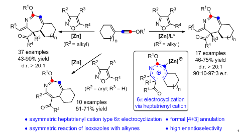 6π電環(huán)化反應(yīng)是構(gòu)建5-7元環(huán)狀化合物很重要的一類反應(yīng),由于其高立體選擇性、高原子經(jīng)濟(jì)性等優(yōu)點(diǎn),近年來受到了很大關(guān)注,已被廣泛應(yīng)用于天然產(chǎn)物和生物活性分子的合成中。但是,對(duì)于催化不對(duì)稱的6π電環(huán)化反應(yīng)卻鮮有文獻(xiàn)報(bào)道,特別是通過不對(duì)稱6π電環(huán)化反應(yīng)構(gòu)建手性七元環(huán)化合物仍未能實(shí)現(xiàn)。2015年,葉龍武課題組首次報(bào)道了異噁唑與炔烴反應(yīng),并先后實(shí)現(xiàn)了相關(guān)的形式上[3+2]和[5+2]環(huán)加成反應(yīng) (Chem. Sci. 2015, 6, 1265;Angew. Chem. Int. Ed. 2017, 56, 605)。該工作發(fā)表后,受到國內(nèi)外10多個(gè)課題組的廣泛關(guān)注,并發(fā)展了幾十類有關(guān)異噁唑與炔烴的高效成環(huán)反應(yīng)。特別是,異噁唑被認(rèn)為是炔烴氮氧雙功能化的一類普遍試劑,可應(yīng)用于各種氮雜環(huán)的高效構(gòu)筑。但是,這些反應(yīng)主要局限于貴金屬(Au和Pt)催化,且尚未有異噁唑與炔烴的不對(duì)稱催化反應(yīng)報(bào)道。
