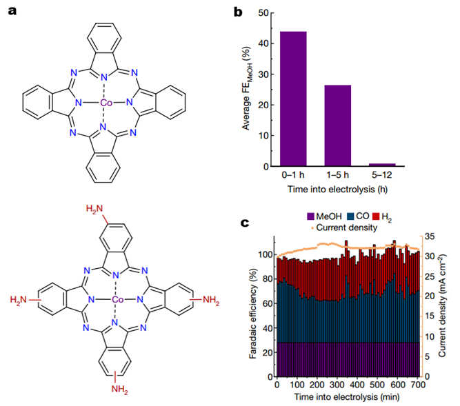 (a)CoPc和CoPc-NH2的分子結(jié)構(gòu);(b)CoPc/CNT在-0.94V下反應(yīng)12個(gè)小時(shí)的甲醇選擇性變化;(c)CoPc-NH2/CNT在-1.00V下反應(yīng)12個(gè)小時(shí)的產(chǎn)物選擇性變化