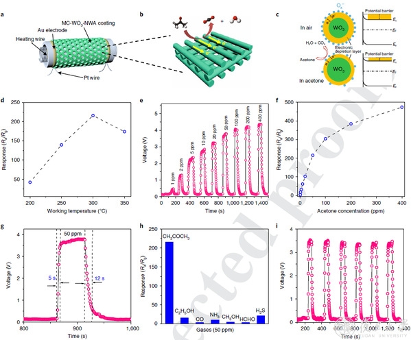 原位表征技術、光譜分析、同步輻射分析及密度泛函(DFT)理論計算結果表明,氧化鎢納米線因晶格中摻入了Si元素而導致常規(guī)的γ-WO3的正八面體結構發(fā)生局部扭曲,因此納米線陣列中的氧化鎢是亞穩(wěn)態(tài)的ε-WO3。進一步研究發(fā)現(xiàn),上述超分子組裝合成思路也適合于其它雜多酸體系,比如硅鉬酸、磷鎢酸、磷鉬酸等單一或多元雜多酸均可以用作為無機前驅物分子,并可以用來合成各種雜原子原位摻雜的半導體金屬氧化物交叉納米線陣列。以Si摻雜ε-WO3正交納米線陣列為例,由于亞穩(wěn)態(tài)ε-WO3納米線陣列結構同時具有3D堆垛多孔結構、豐富的界面活性氧(O-、O2- 等)和良好的電子傳遞行為,該材料展示出優(yōu)異的丙酮傳感響應性能(丙酮是人體呼出氣中與生理、病理相關的標志性揮發(fā)物之一)。
