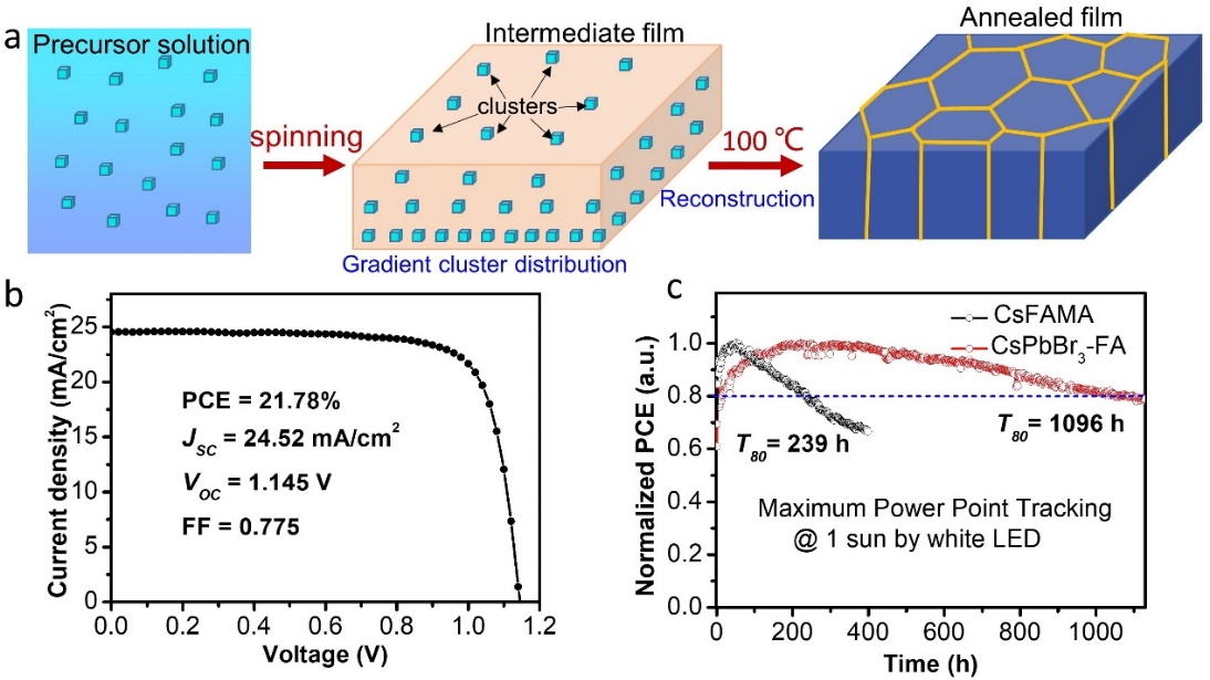 本次研究成果報道了一種基于CsPbBr3簇誘導的、自下而上的鈣鈦礦結晶方式,能夠制備出具有純α相、高質量、低缺陷濃度、無甲胺陽離子的鈣鈦礦膜。研究者發(fā)現(xiàn)預合成的CsPbBr3粉末能在鈣鈦礦前驅液中形成納米尺度的團簇,這些團簇在鈣鈦礦中間體的形成過程中能作為晶種輔助鈣鈦礦膜的生長,并在后續(xù)的退火處理中被除去(圖a)。采用這種制備方法,僅需使用1%-6%的CsPbBr3就能實現(xiàn)高質量、無甲胺陽離子鈣鈦礦的制備,從而使得這種鈣鈦礦太陽能電池的短路電流密度達到24.52 mA/cm2,光電轉換效率達到21.78%(圖b)。更重要的是,優(yōu)化后的鈣鈦礦電池能在工作狀況下(100 mW/cm2光照、最大功率點跟蹤)測試1000小時后,保持82%的初始效率(圖c)。本研究提出了一種新的通過調(diào)控鈣鈦礦前驅液化學組成來制備高效率、高穩(wěn)定性鈣鈦礦電池的方法,后續(xù)有望通過優(yōu)化鈣鈦礦/電荷傳輸層界面,進一步提高鈣鈦礦電池的效率和穩(wěn)定性。