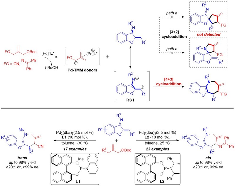 三亞甲基甲烷(TMM)作為一類重要的全碳1,3-偶極子,被廣泛用于多種五元環(huán)類化合物及天然產(chǎn)物的合成中。然而相較于已經(jīng)發(fā)展的非常成熟的TMM參與的[3+2]環(huán)加成反應(yīng),其參與的不對(duì)稱[4+3]環(huán)加成反應(yīng)則未見報(bào)道,主要原因在于該反應(yīng)過程中存在區(qū)域選擇性及立體選擇性調(diào)控的難題。為了解決這一科學(xué)難題,鄧衛(wèi)平教授團(tuán)隊(duì)以橙酮亞胺作為四元氮雜雙烯,巧妙地實(shí)現(xiàn)了鈀催化TMM的不對(duì)稱[4+3]環(huán)加成反應(yīng),并且成功抑制了潛在的[3+2]環(huán)加成反應(yīng)過程,實(shí)現(xiàn)了高度專一的區(qū)域選擇性調(diào)控,該反應(yīng)以優(yōu)秀的收率(84%-98%)、優(yōu)秀的非對(duì)映及對(duì)映選擇性(9:1- >20:1 dr, 94%- >99% ee)合成了一系列結(jié)構(gòu)多樣的手性氮雜卓類化合物。值得注意的是,亞氨基和氰基取代的TMM底物,分別專一的得到了cis和trans構(gòu)型的環(huán)加成產(chǎn)物,從而實(shí)現(xiàn)了立體多樣性合成。上述工作拓展了催化不對(duì)稱[4+3]環(huán)加成反應(yīng)的類型,為手性氮雜卓類化合物的高效合成提供了新的思路,從而為創(chuàng)新藥物研發(fā)提供了重要的分子實(shí)體。