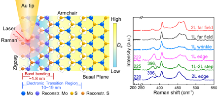 在該工作中,任斌教授課題組通過針尖增強拉曼光譜(TERS)對薄層MoS2一維缺陷(邊緣,臺階和褶皺等)進行高空間分辨的成像,獲得了互相關(guān)聯(lián)的AFM形貌與TERS光譜信息,系統(tǒng)研究了不同缺陷位的結(jié)構(gòu)與電子性質(zhì)。研究發(fā)現(xiàn),與單層MoS2的邊緣和褶皺相比,兩層MoS2的邊緣和一層-兩層之間的臺階位具有獨特的電子-聲子相互作用,從而導(dǎo)致缺陷位附近~1.8 nm范圍內(nèi)材料的能帶發(fā)生彎曲。缺陷位具有特殊電子能帶結(jié)構(gòu)以及高化學(xué)活性(如氧吸附),與完美的晶格結(jié)構(gòu)相比具有較低的電子密度,從而在缺陷位和完美晶格結(jié)構(gòu)之間形成10~19 nm范圍的自由電子擴散長度。此外,該工作還利用對缺陷結(jié)構(gòu)和電子性質(zhì)敏感的拉曼振動模的譜峰位移,發(fā)展出可以區(qū)分不同類型的MoS2邊緣(zigzag和armchair)的方法。該工作表明了TERS在原位、高空間分辨表征缺陷位的結(jié)構(gòu)和電子性質(zhì)方面具有獨特的優(yōu)勢,可以進一步推廣到其他二維材料,從而有效地指導(dǎo)缺陷設(shè)計和材料應(yīng)用。