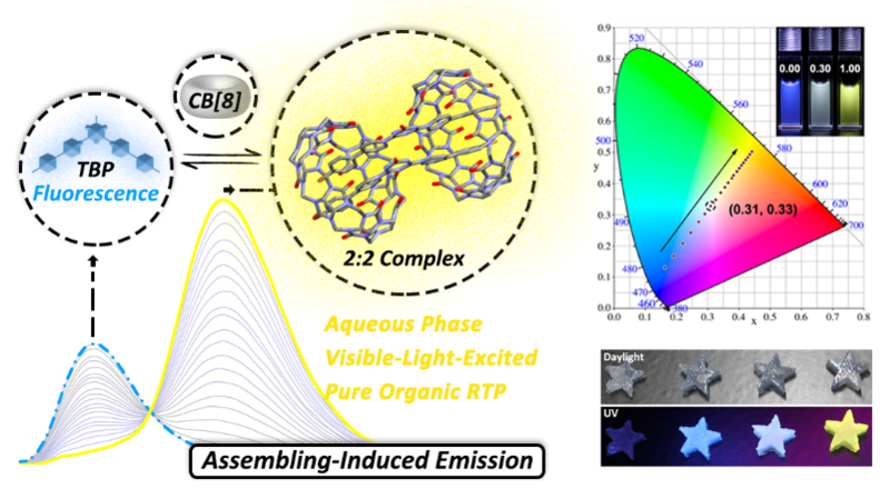 針對這一問題,田禾院士、馬驤教授科研團(tuán)隊(duì)利用常見的超分子大環(huán)主體分子葫蘆[8]脲和簡單的染料客體分子,首次實(shí)現(xiàn)基于主客體組裝的可見光激發(fā)水相純有機(jī)室溫磷光。這一特殊的主客體絡(luò)合物也被用于實(shí)現(xiàn)Hela細(xì)胞成像以及多色發(fā)光水凝膠的制備,具有潛在的生物應(yīng)用價值。這一通過組裝誘導(dǎo)發(fā)光(Assembling-Induced Emission)實(shí)現(xiàn)水相純有機(jī)室溫磷光的策略,打破了前期工作中溶液態(tài)磷光猝滅的限制,有望在時間分辨成像領(lǐng)域結(jié)合磷光的長壽命特性實(shí)現(xiàn)新的突破,為水相室溫磷光的構(gòu)建提供了新的思路。