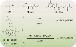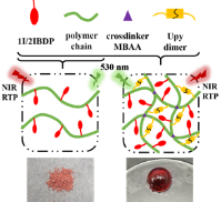 另一方面,迄今為止,有關(guān)近紅外室溫磷光的研究成果鮮有報(bào)道,并且研究對象多為含重金屬的有機(jī)配合物。針對設(shè)計(jì)制備具有長波長(如近紅外)發(fā)射的有機(jī)室溫磷光材料,并拓展其在化學(xué)生物學(xué)等領(lǐng)域的應(yīng)用這一難點(diǎn)問題,馬驤教授團(tuán)隊(duì)使用了一種巧妙但高效的自由基聚合方法,將含碘的Bodipy染料與丙烯酰胺共聚,得到了一系列由可見光激發(fā)、具有近紅外室溫磷光發(fā)射的無定形態(tài)聚合物材料。該體系通過引入碘原子來促進(jìn)系間竄躍,其使用的丙烯酰胺聚合物剛性結(jié)構(gòu)不僅可以減弱發(fā)光分子的振動,也可以減少外界的氧氣等猝滅因素的干擾,從而減少非輻射躍遷。此外,通過在聚合反應(yīng)中引入交聯(lián)劑和含有四重氫鍵的基團(tuán),該研究團(tuán)隊(duì)還得到了具有快速自修復(fù)功能的近紅外室溫磷光凝膠。