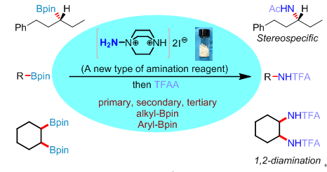 最近,他們團隊與浙江工業(yè)大學的靳立群教授合作成功發(fā)展了以DABCO的氨基季銨鹽(H2N-DABCO)作為新型胺化試劑并首次將該胺化試劑用于有機頻哪醇硼酸酯的胺化反應中(下圖)。產(chǎn)率最高可達96%,且反應具有立體專一性、廣譜的官能團兼容性等。