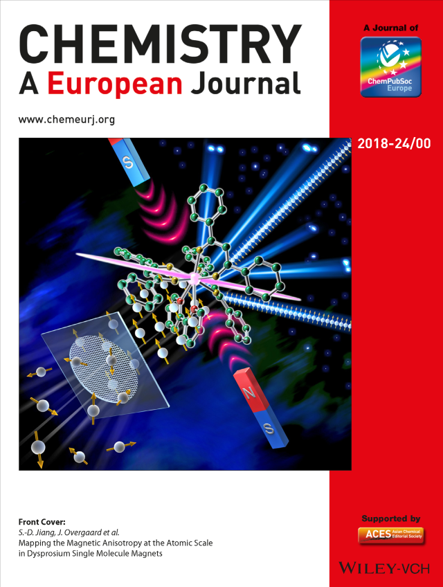但是這種單晶磁化率測試的手段具有明顯的局限性,只適用于極個別的對稱性情況,對于分子與晶體的各向異性軸不重合的情況下,無法嚴(yán)格確定分子磁軸取向(Chem.-Eur. J., 2013, 19, 13726)。為解決此問題,蔣尚達(dá)與丹麥Aarhus大學(xué)的Jacob Overgaard博士等合作,采用極化中子衍射(Polarized Neutron Diffraction)的方法,解決了任意空間群中低對稱性磁性離子的磁軸取向測定問題,該工作以封面文章的形式發(fā)表在《歐洲化學(xué)》雜志上,并被選為VIP文章(Chem.-Eur. J., 2018, 24, 16576)。